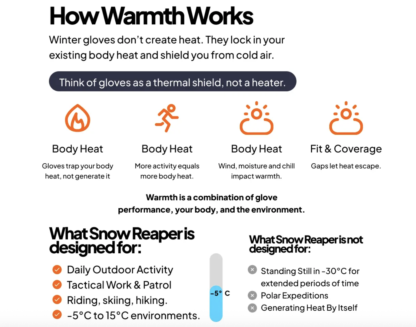 Same warmth as thick winter gloves, but lighter and easier to move in.